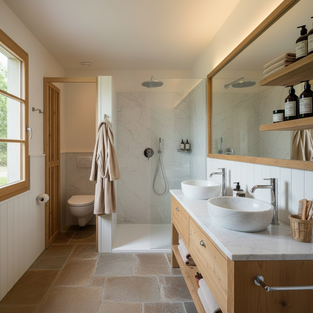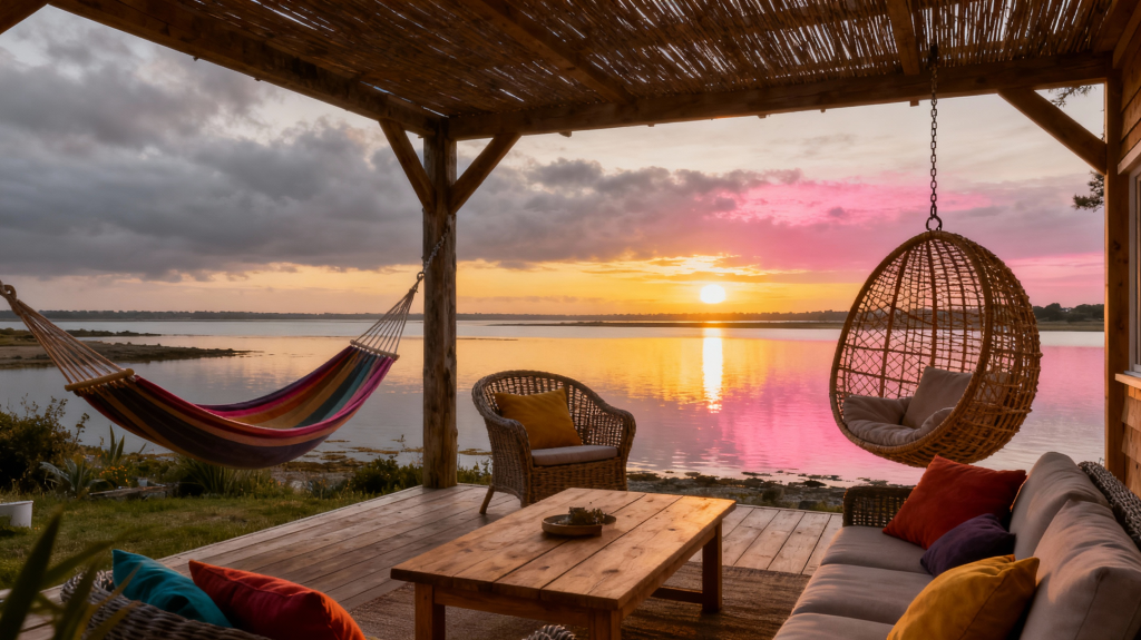 La terrasse couverte devient une extension de vie : salon de jardin, hamac ou fauteuils suspendus invitent à passer des soirées inoubliables au coucher du soleil. Des jumelles et guides touristiques enrichissent l'expérience de découverte locale.